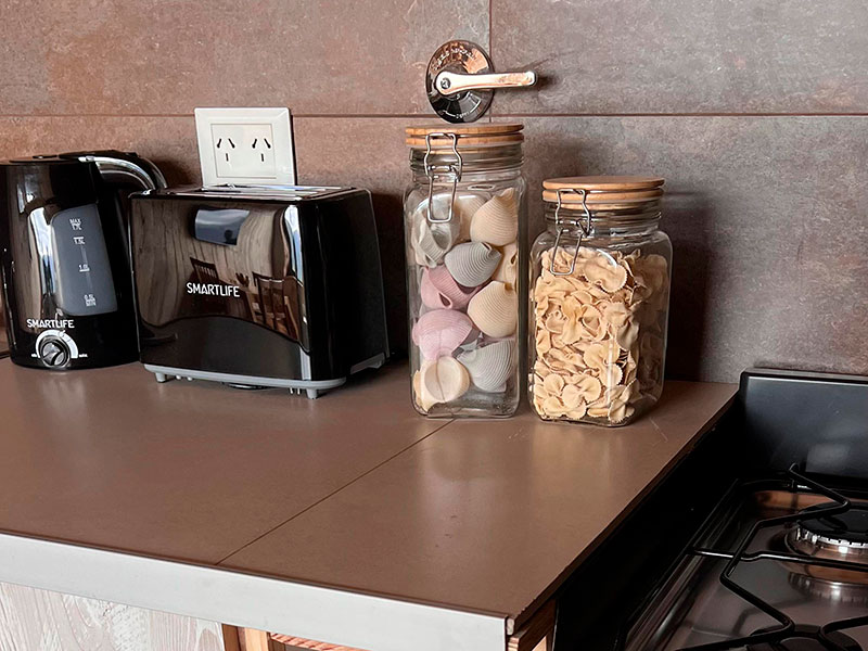 • Cocina equipada con horno, vajilla completa, microondas, tostadora, cafetera y pava eléctrica.